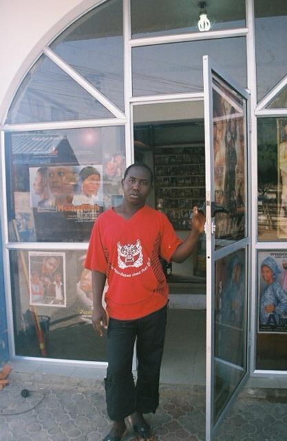 Baba Karami standing in front of Karami CD Palace with all the glass broken out of the shop front following the post-election violence in Kano 2011, photo taken 19 April 2011. Compare to photos taken in 2009, and note how all the goods have been stripped from front of shop, but business continues on. (c)Carmen McCain